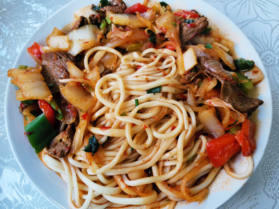 テーブルに運ばれてきたラグマンは、以前と変わらないものでした。明らかに量が多く、横から見れば麺がこんもり、掘り起こしてみればごっそりです。