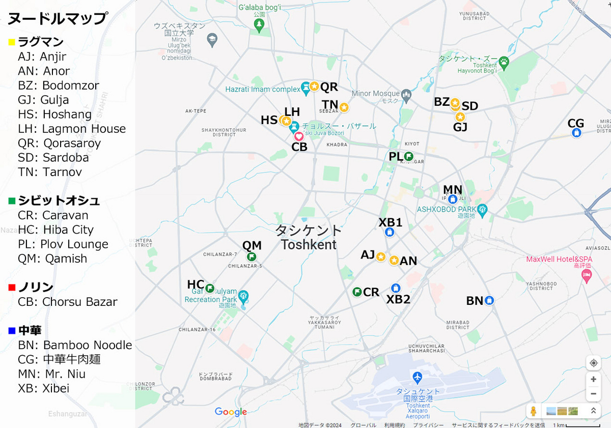プロフマップ、シャシリクマップに続いて、ヌードルマップを作ってみました。これまでタシケントで食べた麺類 (ラグマン、ノリン、シビットオシュ、中華麺) をほとんど載せていますが、どこで何を食べてもだいたい美味しいと思います。